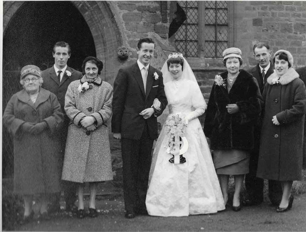 Group photo of the the wedding on 17 December 1960 at St Andrew’s Church Spratton. Vicar – Revd Dennis Pettit.