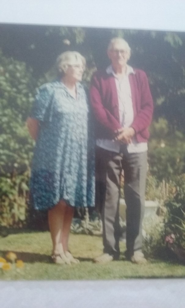 Arthur and Marie Tustin in the garden of their home, 12 School Road. This stone cottage was later demolished, and the site was redeveloped. It is not known when the photo was taken.