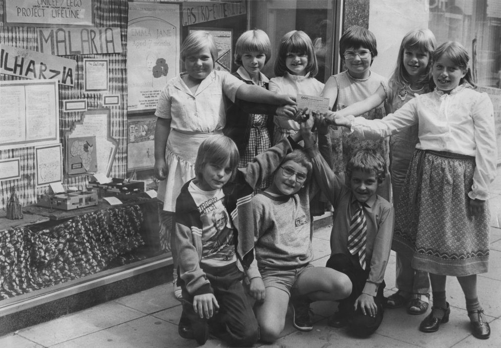 "Children from Class 2 of Spratton C of E School with the cheque for £91 which they have raised for UNICEF outside the Gateway Building Society where their model village is on display."