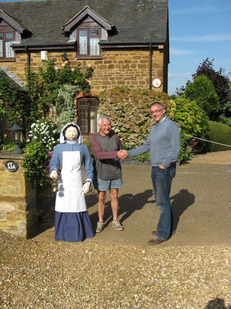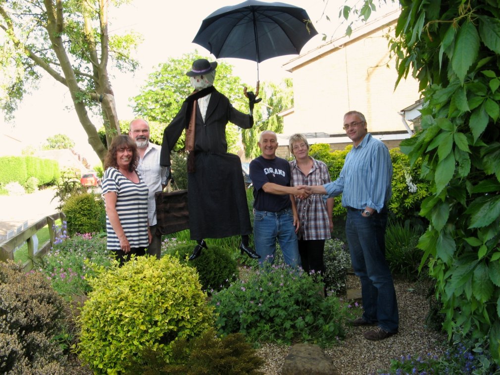 Barry Frenchman, Parish Council Chairman and Spratton's District Councillor, presents a cash prize of £35 to Trevor Robinson (seen here with his wife) for his winning Mary Poppins. On the left are two of the other judges Pauline and Nigel Shaw