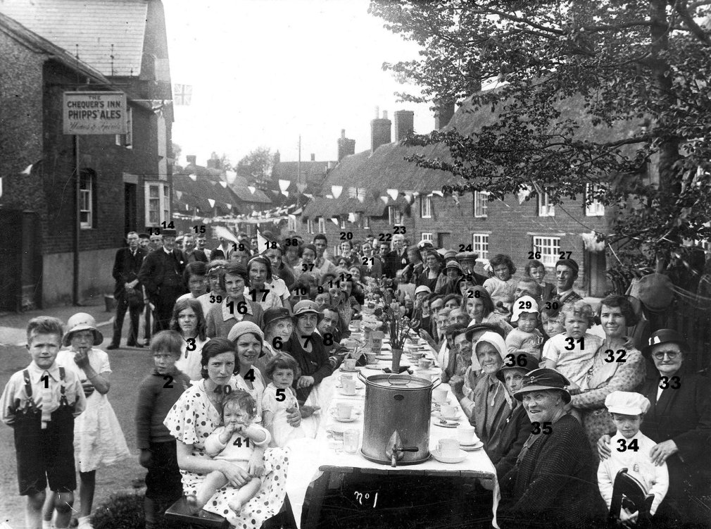 1. Peter Clegg, 2. Lou Horne ('Knocker'), 3. Joy Smith, 4. Doll Phillips, 5. Pam Phillips, 6. Mrs Ashley Bates, 7. Gladys Harris (Mrs Tommy), 8. Tommy Harris (Baker), 9. Nell Cook, 10. Frank Cook, 11. Bertha Manning, 12. Louie Payne, 13. George Shaw (headmaster), 14. Rev. George Raw, 15. Fred Tucker, 16. Millie Cattell, 17. Mary Horne, 18. Molly Wingrove, 19. Madge Buckby, 20. Renee Bannister, 21. Gert Bannister, 22. Eric Moss, 23. Harry Bannister (landlord of the Chequers Inn), 24. Harry Cook, 25. Betty Wilkes, 26. Mavis Wilkes, 27. Bert Wilkes, 28. Bet Horne, 29. Derek Wykes, 30. Cora Wykes, 31. Cynthia Wright, 32. Winnie Wykes, 33. Jenny Horne, 34. Alan Wykes, 35. Mrs Hudson, 36. probably Alice Muggleton (retired baker) (their elder daughter was Alice Elizabeth, Lizzie), 37. Sheila Burgoine, 38. Jean Roche, 39. Wyn Griffin, 40. Mrs Cook, 41. Donald Cook