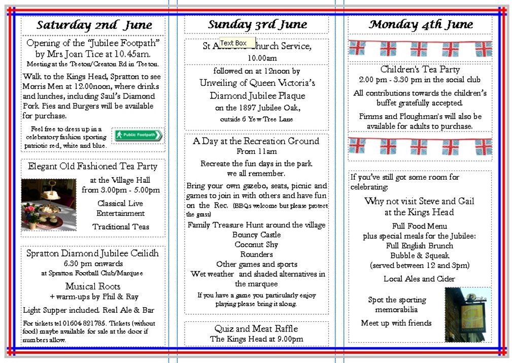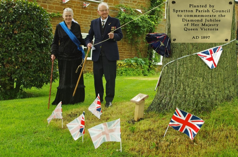 In 1897, the Parish Council planted an oak tree on a small green in the village of Spratton. This has gone unrecognised, so it was decided to mark it with a similar plaque, in memory of the Diamond Jubilee of Queen Victoria, which was unveiled by the oldest resident, Tom Smith 96, in the presence of 'Queen Victoria' (Cherill Hammond).