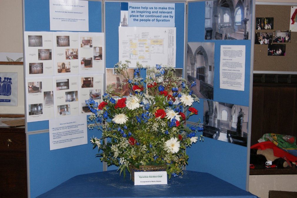 Display by Spratton Garden Club with a display of the proposals for re-ordering the Church behind.