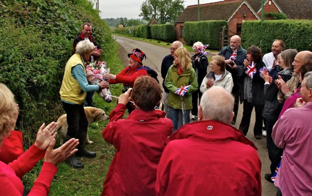 Jay Tindale presents a bouquet of flowers to Joan Tice who had given the land and organised this footpath. Tracey George in front of Peter Andrews, Meg Price, Athene Frisby, Nigel Shaw, Pauline Shaw, Brian Farmer, Hazel Petersen, Roger Frisby