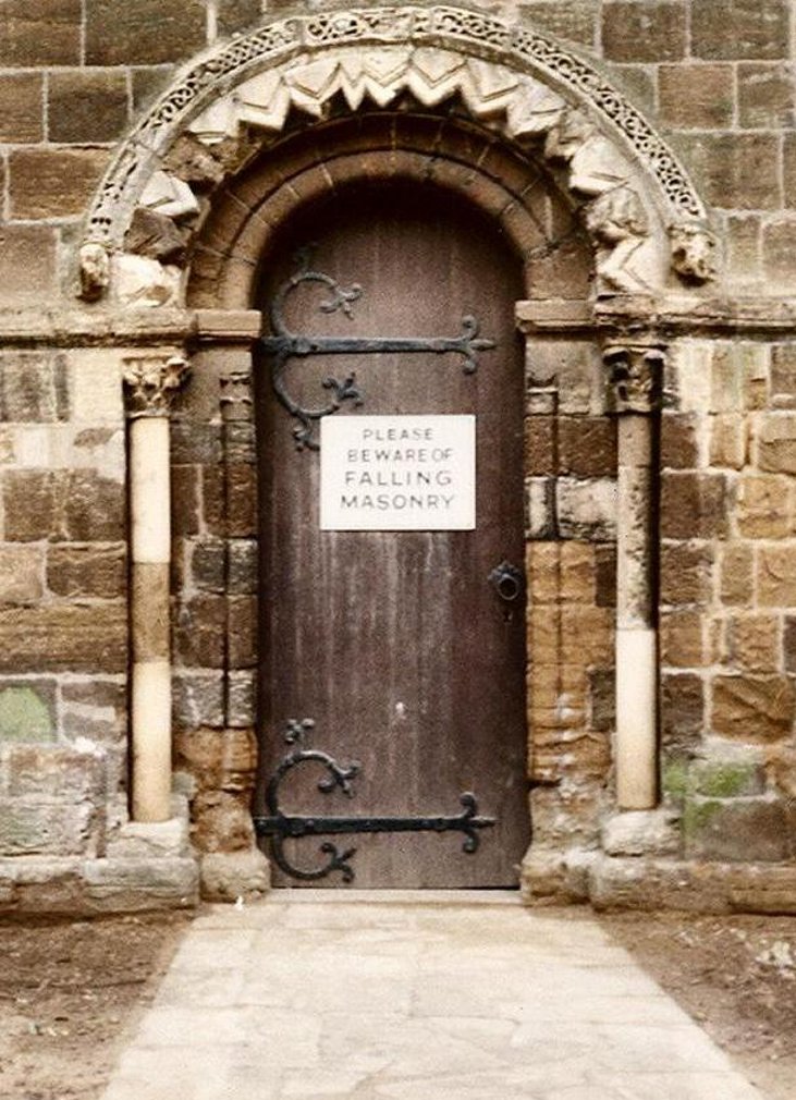 The sign warning of the danger of falling masonry before its removal
