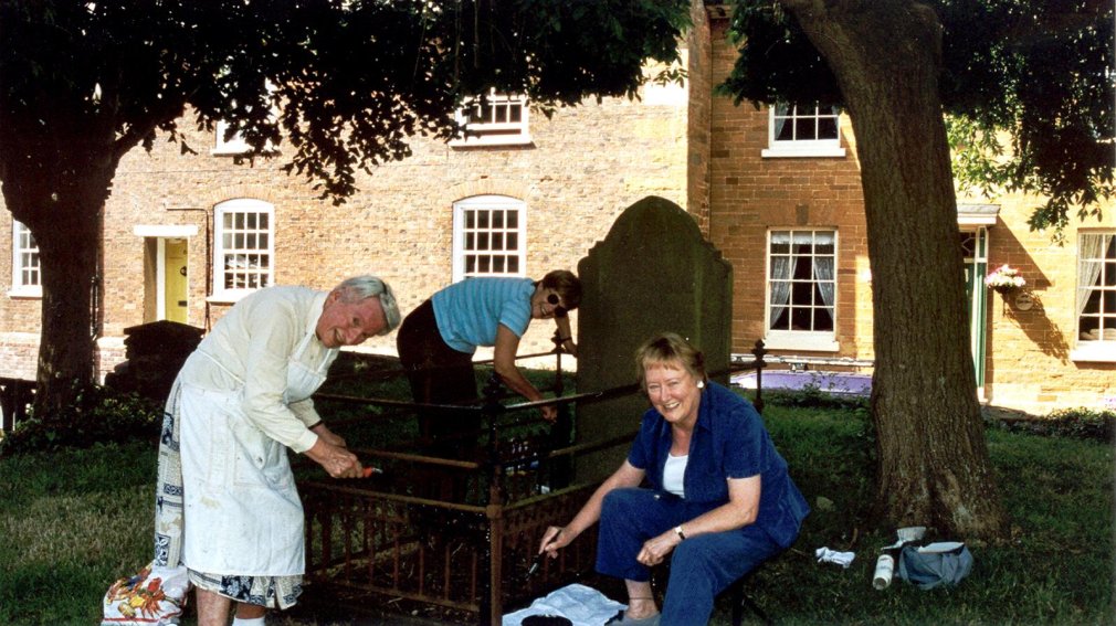 Volunteers preparing and painting the railings around the graves and tombs, Doris Lloyd-Thomas, Mary Spearman and Enid Jarvis, chairman