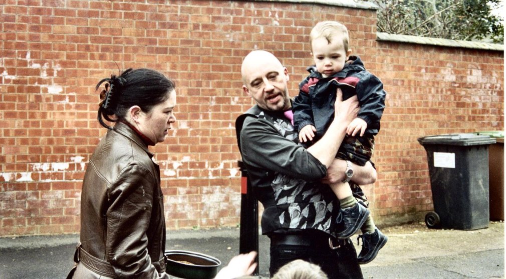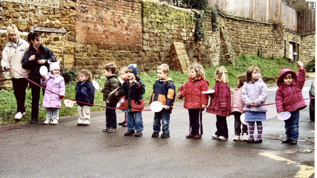 May Queen group at the corner of Holdenby Road and Church Road with Holly House, Spratton House and the Shieling in the background. The cob wall is clearly shown with plaster rendering. Those named are 1. Millie Wykes, 2. Hector Manning (?), 3. Florence Balderson ('Cis'), 4. Tilly Balderson, 5. Len Hayter, 6. Mrs Wooding, 7. Tony Wykes and 8. Josie Phillips