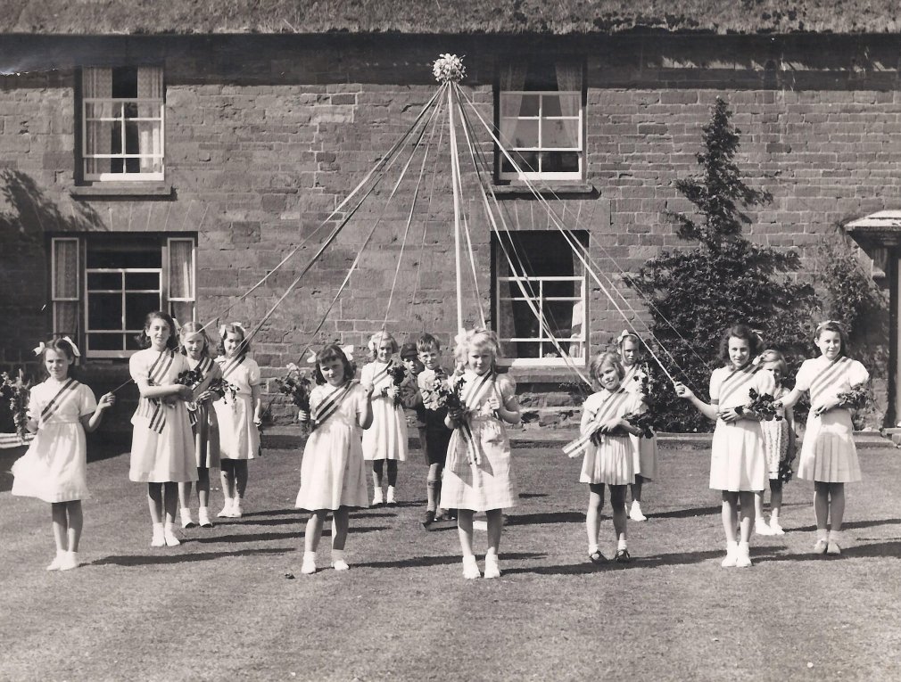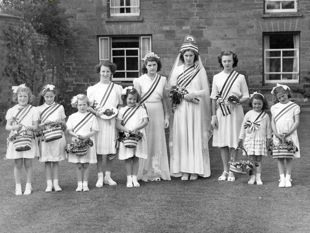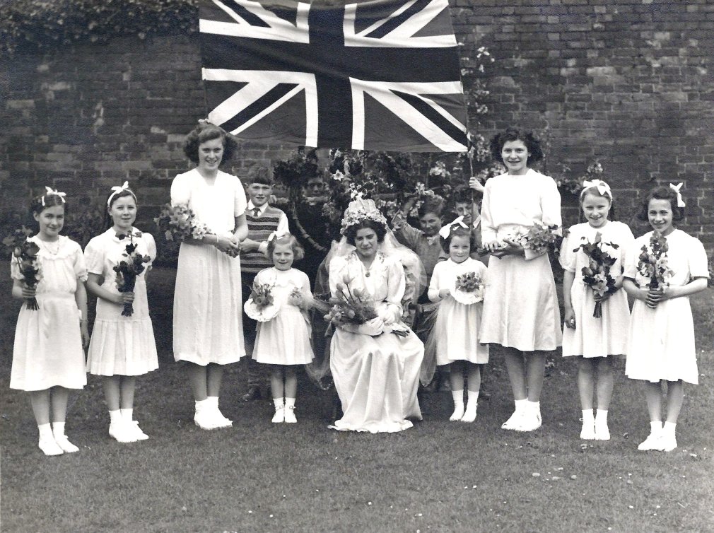 Back row: Glynis Jones, Christine Kelly, Mrs Amos crowning Janice Horne (May Queen), Ivy Novak, Christine Wykes