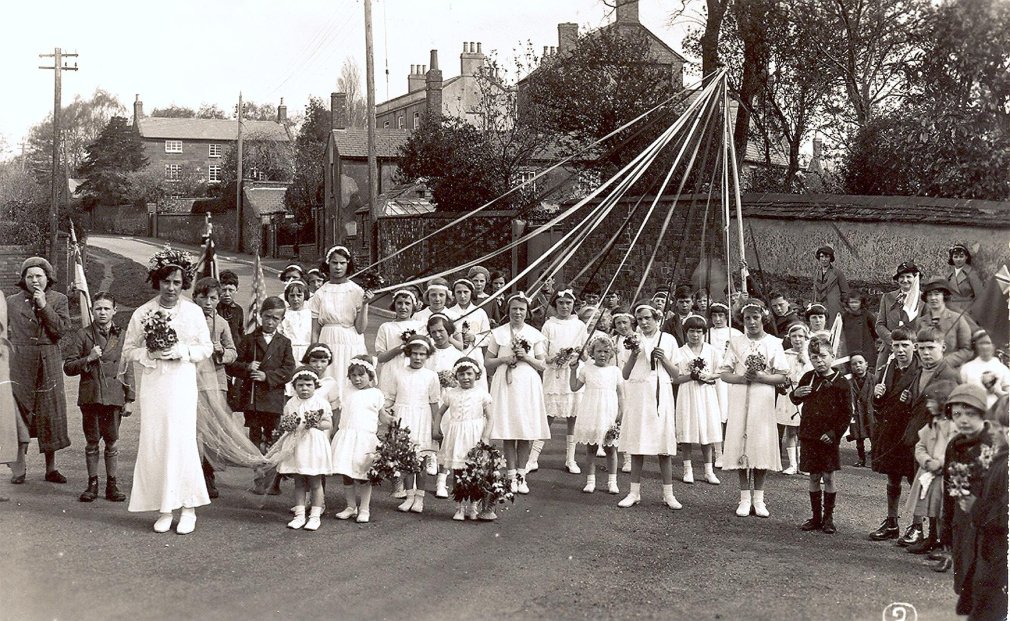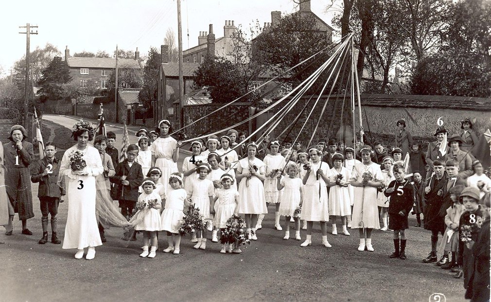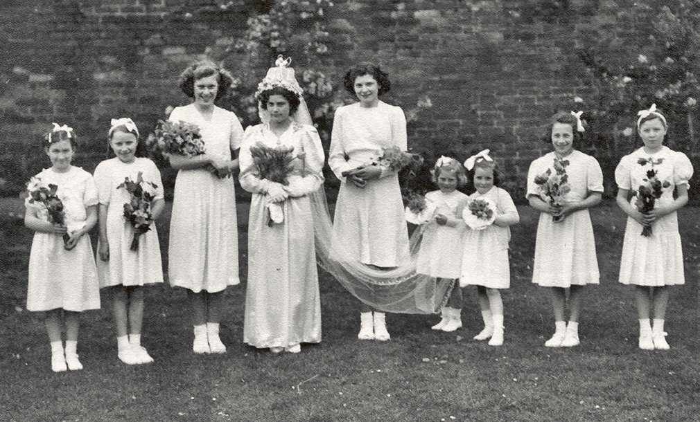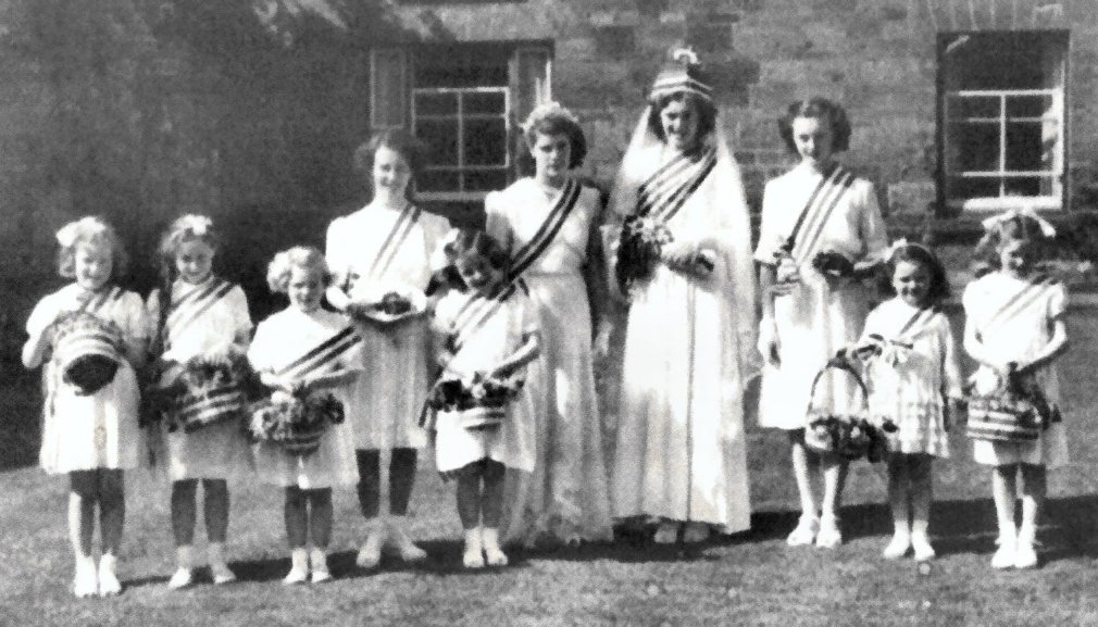 Back row: Audrey Wykes, Eva Frisby, Bet Horne, Mary Wykes, Joan Hicks, Mary Buckby (May Queen), Barbara Buckby, Doris Manning, Moira Copson, Beryl Tarpley