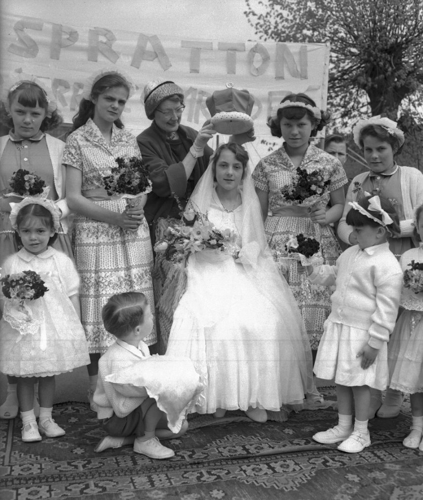 Back row: Glynis Jones, Christine Kelly, Mrs Amos crowning Janice Horne (May Queen), Ivy Novak, Christine Wykes