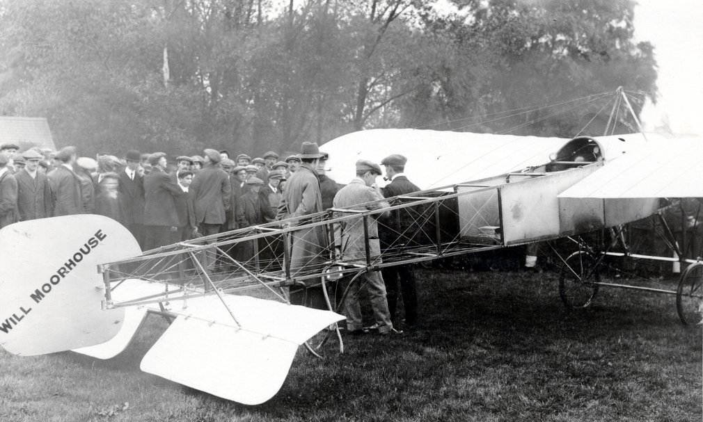 William Rhodes-Moorhouse in his aeroplane, probably on Northampton Racecourse with Lt-Col Edgar Mobbs standing alongside. Mobbs became head of the 7th Northampton battalion in 1916, but was killed at Ypres on 31 July 1917, and awarded the D.S.O. posthumously. On Sunday 17 July 1921 a memorial to Lt-Col Edgar R Mobbs, D.S.O., was unveiled on Northampton Market Square. It was moved in 1938 to the Garden of Rest on Abington Square.