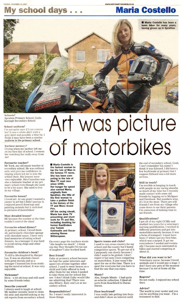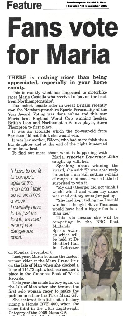 Maria Costello, aged 31, from Spratton, once the fastest woman to lap the Isle of Man TT circuit, received the award for services to motorcycling. She said: "I am so humbled by this honour. It's amazing to receive it for services to motorcycling. Motorbikes have been my life and I feel like this award gives something back, not only to me but to all those involved in motorcycling. It's great recognition for the sport, too, and I hope we see more females on motorbikes and in racing. I can't thank enough all those who have helped and supported me." Maria, the 2005 BBC Northampton Sports Personality of the Year, will receive her award from the Queen at a ceremony at St James's Palace later in the year. But she has revealed she did not believe the honour was real at first. She explained: "I tried to forget about it in case it was a wind up. It was when I got a message on Facebook from Keith Jackson from The Sun saying: 'Believe it! You're getting an MBE' that it started to sink in. "I kept it pretty much to myself. I rang my mum and sister as my dad already knew, and told my friends and we shared a bottle of champagne. "My family are so proud and even my Mum, who wasn't so keen on me starting racing, is fully behind me for this year's Manx Grand Prix. I'm reinvigorated by the MBE, although I won't believe it until I meet the Queen." Maria's busy schedule will see her compete in Belgium at the weekend in the Four Hours of Spa Classic.