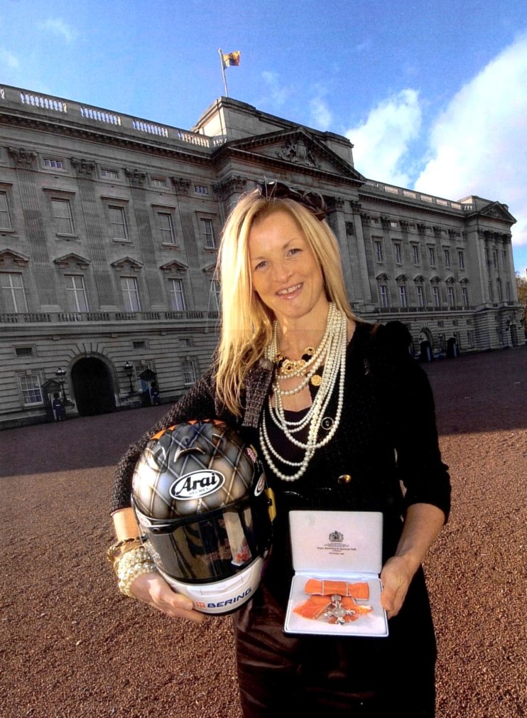 The biker, who was the first woman rider to claim a podium finish at a race around the Isle of Man TT course and held the female lap-speed record for five years, received her honour from the heir to the throne at a special day at Buckingham Palace.
