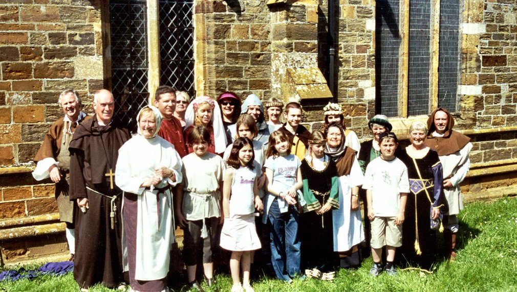 Back row: Nigel Townsend (Master Builder), Bill Blowfield (Father John Martin), Darren Sibley (Young Sir John Swinford), Cherill Hammond (Tourist), Tracey Coldwell (Lady Joan Swinford), Sam Hammond (Tourist), Rev. Brian Lee (Ghost of Sir John Swinford), Sue Laste (Lady in Waiting), Daniel Mattin (Roger Chambers), Ellie Tee (Elizabeth Swinford), Jean Sutch (Lady in Waiting), Roger Scanlan (Walter Bolekek).