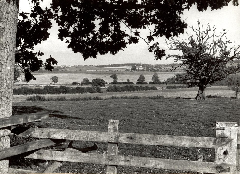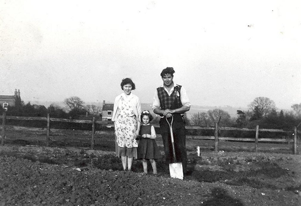Ursula, Julia & Lewis Dickens ('Nigger') in their garden in Orchard Close with, in the background, the land before Ryefields was built