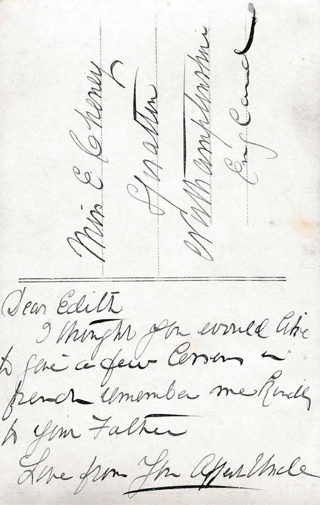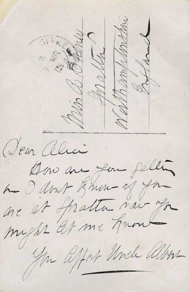 James was born in Lambeth, London, on 22 October 1882. When he was 20 he joined the Royal Navy giving his previous occupation as plasterer. He served on a number of different ships as a stoker from 1902 and lived for a time in the naval barracks at Chatham, Kent. In 1912 he married a Spratton girl, Hannah Elizabeth Blakesley, the daughter of Edward and Mary Blakesley from First Turn. The couple were married in the Parish Church, Spratton and lived in the village until about 1922. James served in the Royal Navy during the First World War mainly on the ships Dominion and Pembroke II and his name is on the Spratton Absent Voters List for 1918. He left the Royal Navy in 1922 as a Chief Petty Officer and became an inspector for the RSPCC and moved to Canterbury, Kent. Later James and Elizabeth emigrated to Toronto, Canada, to be with their son and they both died there in 1973.