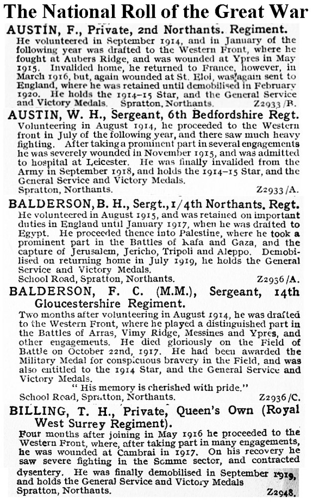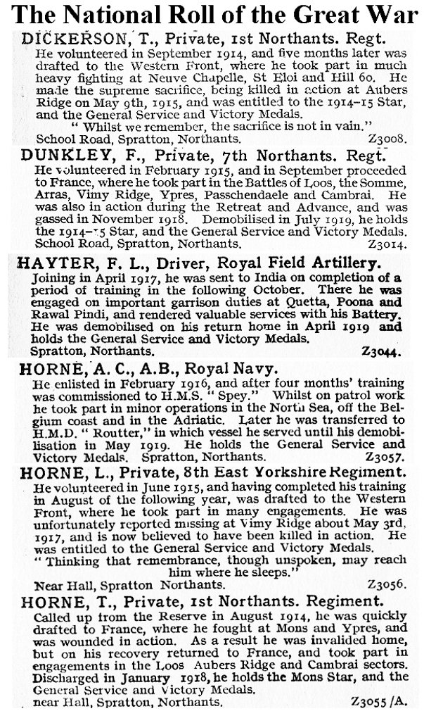 Private Walter E Hayter of the 1st Battalion, Northamptonshire Regiment, who was killed in action aged 21 years in July 1915 and is buried in the Quarry Cemetery, Vermelles, France. He is also remembered in an inscription on the grave of his mother Priscilla in the old Spratton Cemetery on the Brixworth Road.