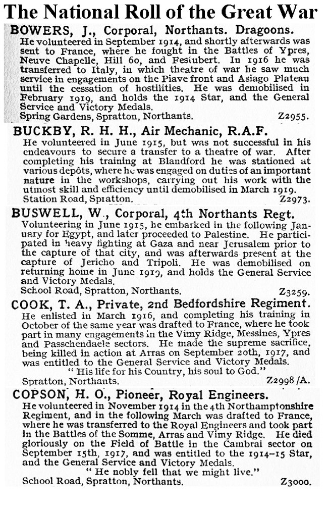 The names of 18 young men are inscribed on metal panels. Of the 57 men of Spratton who enlisted in the First World War, the following did not return and are commemorated on the War Memorial.