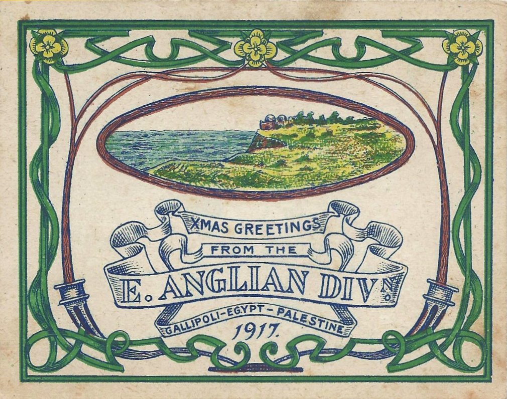 Christmas card from Palestine from George Manning of the East Anglian division. Inside it shows a sketch of Mejdel Yaba and the Plain of Sharon, Palestine, captured March 1918
